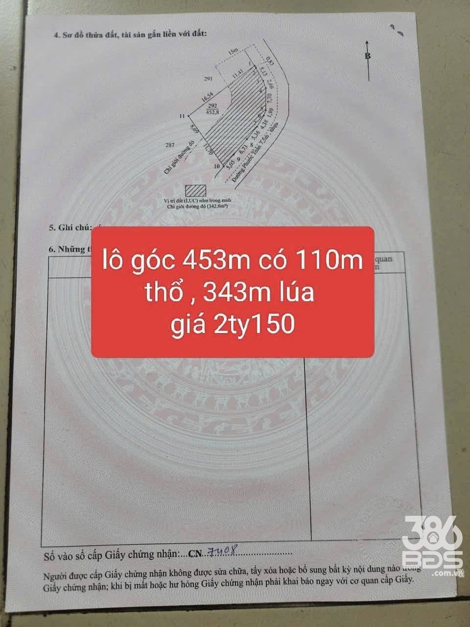 Tổng dt : 453m2 sổ hồng riêng (có 110m2 thổ cư và 343m2 đất lúa ).